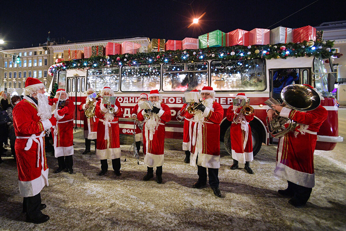 Un autobus con un'orchestra di Ded Moroz, la versione russa di Babbo Natale, attraversa la città.